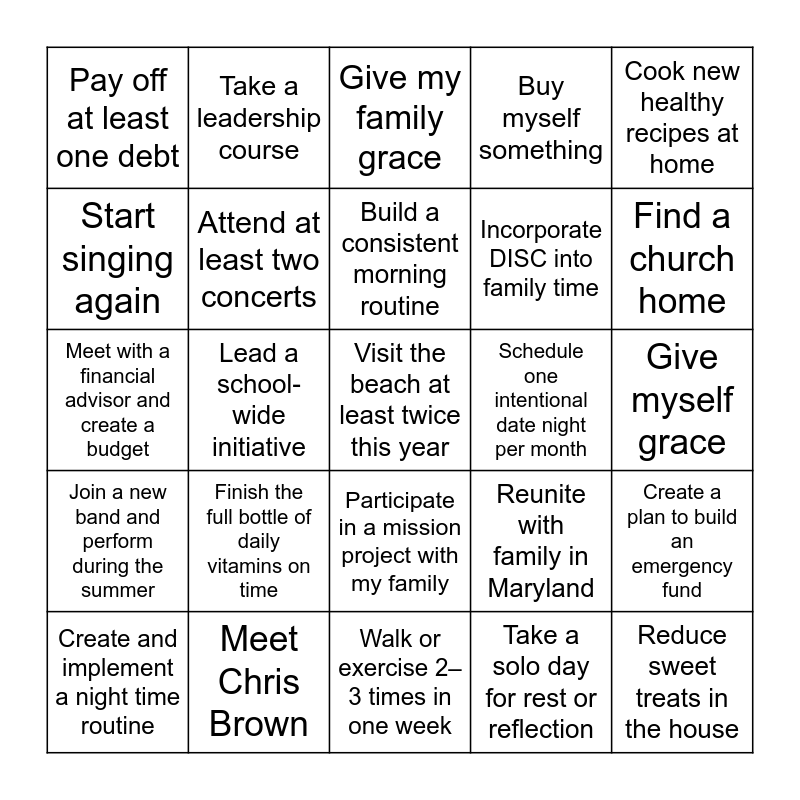 This bingo card has 25 words: Finish the full bottle of daily vitamins on time, Walk or exercise 2–3 times in one week, Build a consistent morning routine, Create and implement a night time routine, Cook new healthy recipes at home, Pay off at least one debt, Start singing again, Take a leadership course, Schedule one intentional date night per month, Participate in a mission project with my family, Incorporate DISC into family time, Meet with a financial advisor and create a budget, Reunite with family in Maryland, Create a plan to build an emergency fund, Attend at least two concerts, Reduce sweet treats in the house, Give myself grace, Give my family grace, Find a church home, Lead a school-wide initiative, Visit the beach at least twice this year, Meet Chris Brown, Join a new band and perform during the summer, Buy myself something and Take a solo day for rest or reflection.