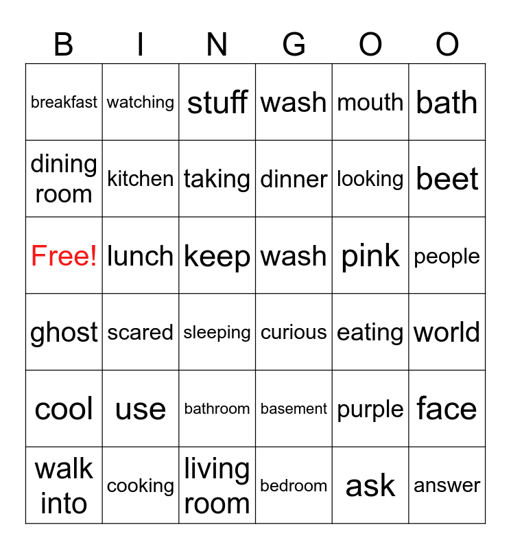 This bingo card has 36 words: basement, bathroom, bedroom, dining room, ghost, wash, kitchen, living room, mouth, purple, beet, wash, face, lunch, dinner, breakfast, cool, pink, Free!, stuff, keep, scared, curious, sleeping, eating, watching, looking, cooking, taking, bath, answer, walk into, world, people, use and ask.