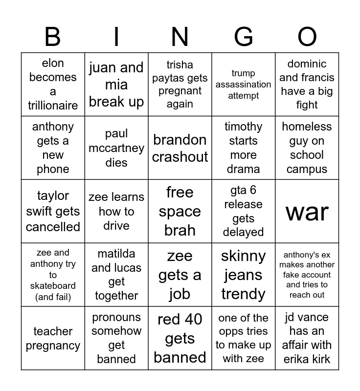 This bingo card has a free space and 24 words: matilda and lucas get together, pronouns somehow get banned, brandon crashout, teacher pregnancy, dominic and francis have a big fight, elon becomes a trillionaire, anthony gets a new phone, juan and mia break up, gta 6 release gets delayed, zee gets a job, timothy starts more drama, taylor swift gets cancelled, skinny jeans trendy, anthony's ex makes another fake account and tries to reach out, paul mccartney dies, one of the opps tries to make up with zee, war, trisha paytas gets pregnant again, homeless guy on school campus, zee learns how to drive, jd vance has an affair with erika kirk, zee and anthony try to skateboard (and fail), trump assassination attempt and red 40 gets banned.