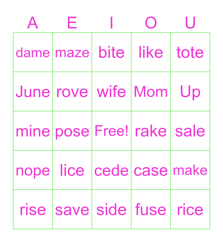 This bingo card has a free space and 167 words: Cat, Elf, Pig, On, Up, Sand, Tell, Lip, Song, Sun, Tan, Send, Mom, Run, Pan, Ten, Pin, Long, Bun, Land, Red, Tin, Gone, Fun, ape, ate, bake, bale, base, cake, came, cape, case, cave, dame, daze, fade, fake, fame, game, gate, gave, gaze, hate, haze, lake, late, made, make, male, maze, name, rake, sale, same, save, take, tape, wade, wake, wave, eke, eve, here, gene, mete, cede, Pete, ice, rise, nine, life, like, ripe, mile, wide, time, mile, wide, time, vice, bite, live, nice, wise, line, wife, bike, ride, pipe, dime, pile, dive, rice, mine, hike, hide, wipe, kite, mice, wine, side, dice, fine, vine, lice, bone, code, cone, cope, cove, dole, dome, dose, dote, hole, home, hope, joke, lobe, lone, mode, mole, mope, nope, nose, note, poke, pole, pope, pose, robe, rode, rope, rose, rove, sole, tone, tote, vole, vote, woke, wove, zone, use, cube, cute, dude, duke, dune, dupe, fume, fuse, huge, June, lute, mule, muse, mute, nude, rude, rule, rune, ruse, tube, tune and yule.