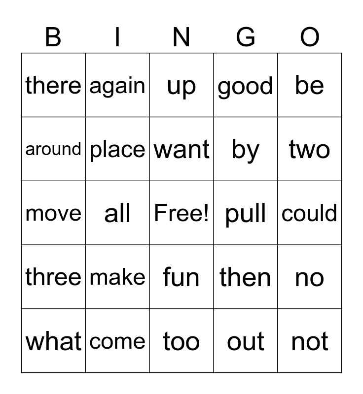 This bingo card has a free space and 45 words: does, not, school, what, down, out, up, very, be, come, good, pull, fun, make, they, too, jump, move, run, two, again, help, new, there, use, could, live, one, then, three, eat, no, of, under, who, all, call, day, her, want, around, by, many, place and walk.