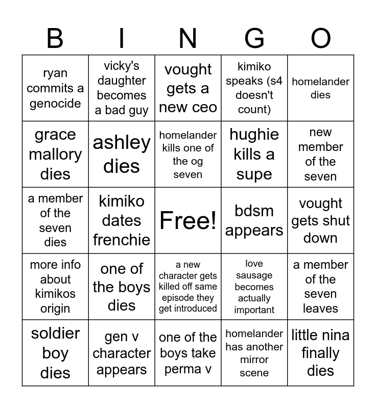 This bingo card has a free space and 24 words: one of the boys dies, gen v character appears, homelander kills one of the og seven, soldier boy dies, homelander dies, ryan commits a genocide, grace mallory dies, vicky's daughter becomes a bad guy, bdsm appears, a new character gets killed off same episode they get introduced, hughie kills a supe, a member of the seven dies, love sausage becomes actually important, a member of the seven leaves, ashley dies, homelander has another mirror scene, vought gets shut down, vought gets a new ceo, new member of the seven, kimiko dates frenchie, little nina finally dies, more info about kimikos origin, kimiko speaks (s4 doesn't count) and one of the boys take perma v.