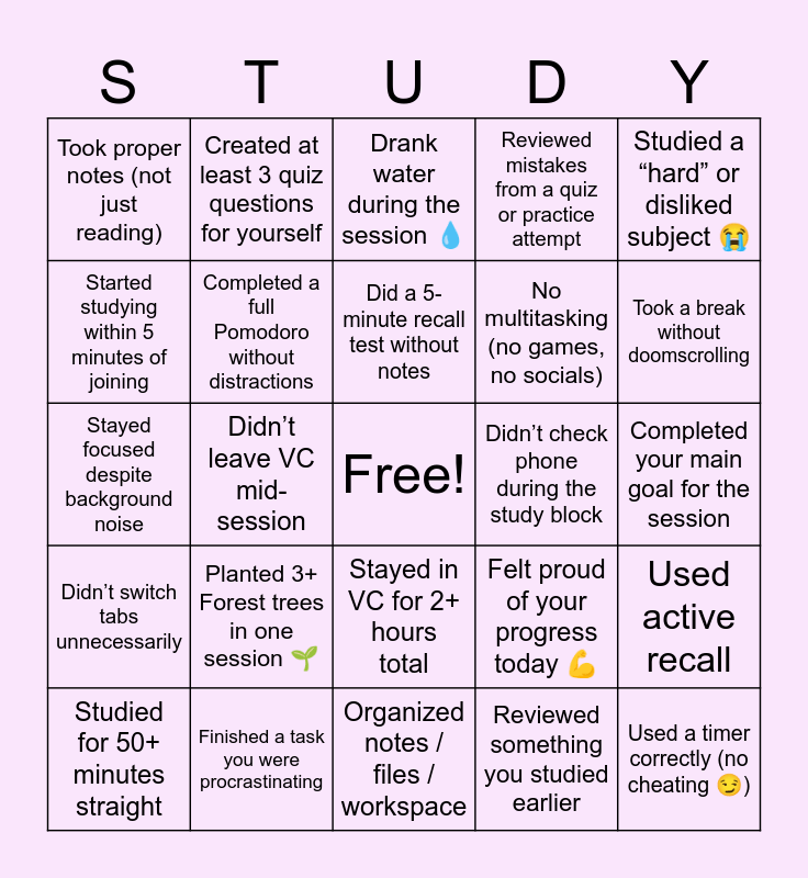 This bingo card has a free space and 29 words: Studied for 50+ minutes straight, Wrote at least one full page / solved 10+ questions, Didn’t leave VC mid-session, Studied even though you didn’t feel like it, Took proper notes (not just reading), Drank water during the session 💧, Completed a full Pomodoro without distractions, Planted 3+ Forest trees in one session 🌱, Didn’t check phone during the study block, Finished a task you were procrastinating, Completed your main goal for the session, Used a timer correctly (no cheating 😏), Organized notes / files / workspace, Reviewed something you studied earlier, Took a break without doomscrolling, Checked off at least 3 tasks today, Stayed in VC for 2+ hours total, Didn’t switch tabs unnecessarily, Studied a “hard” or disliked subject 😭, Stayed focused despite background noise, Felt proud of your progress today 💪, Shared your study goal at the start, No multitasking (no games, no socials), Started studying within 5 minutes of joining, Reviewed mistakes from a quiz or practice attempt, Created at least 3 quiz questions for yourself, Used active recall, Did a 5-minute recall test without notes and Completed a self-quiz (flashcards, practice questions, recall).