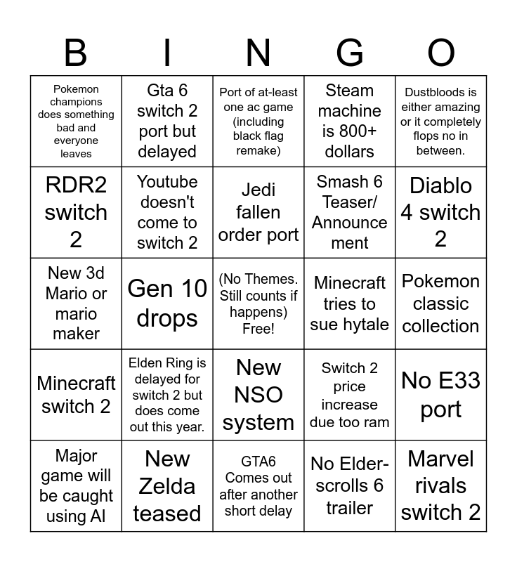 This bingo card has a free space and 24 words: Elden Ring is delayed for switch 2 but does come out this year., New Zelda teased, Jedi fallen order port, Major game will be caught using AI, Dustbloods is either amazing or it completely flops no in between., Pokemon champions does something bad and everyone leaves, RDR2 switch 2, Gta 6 switch 2 port but delayed, Minecraft tries to sue hytale, New NSO system, Smash 6 Teaser/ Announce ment, New 3d Mario or mario maker, Switch 2 price increase due too ram, No E33 port, Youtube doesn't come to switch 2, No Elder-scrolls 6 trailer, Pokemon classic collection, Port of at-least one ac game (including black flag remake), Diablo 4 switch 2, Gen 10 drops, Marvel rivals switch 2, Minecraft switch 2, Steam machine is 800+ dollars and GTA6 Comes out after another short delay.