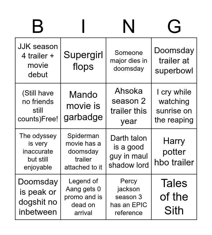 This bingo card has 16 words: Legend of Aang gets 0 promo and is dead on arrival, Harry potter hbo trailer, Someone major dies in doomsday, JJK season 4 trailer + movie debut, The odyssey is very inaccurate but still enjoyable, Supergirl flops, Darth talon is a good guy in maul shadow lord, Percy jackson season 3 has an EPIC reference, (Still have no friends still counts)Free!, Mando movie is garbadge, Doomsday is peak or dogshit no inbetween, Doomsday trailer at superbowl, Spiderman movie has a doomsday trailer attached to it, I cry while watching sunrise on the reaping, Ahsoka season 2 trailer this year and Tales of the Sith.