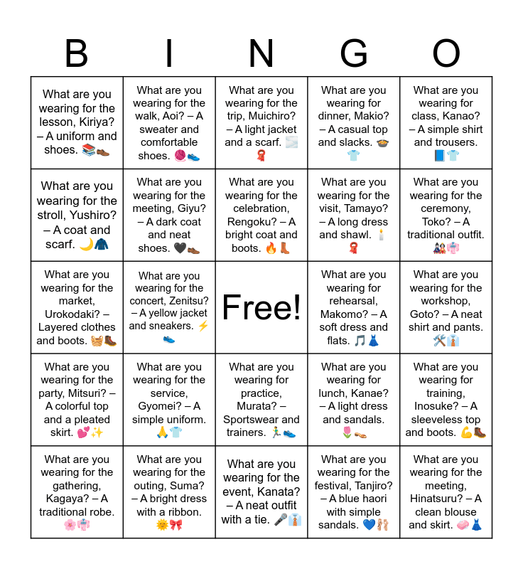 This bingo card has a free space and 32 words: What are you wearing for the festival, Tanjiro? β A blue haori with simple sandals. ππ©°, What are you wearing for the school play, Nezuko? β A pink dress with a soft cardigan. πΈπ§₯, What are you wearing for the concert, Zenitsu? β A yellow jacket and sneakers. β‘π, What are you wearing for the picnic, Shinobu? β A light blouse and a long skirt. πΌπ, What are you wearing for the party, Mitsuri? β A colorful top and a pleated skirt. πβ¨, What are you wearing for the meeting, Giyu? β A dark coat and neat shoes. π€π, What are you wearing for class, Kanao? β A simple shirt and trousers. ππ, What are you wearing for training, Inosuke? β A sleeveless top and boots. πͺπ₯Ύ, What are you wearing for the walk, Aoi? β A sweater and comfortable shoes. π§Άπ, What are you wearing for the ceremony, Obanai? β A black uniform with a belt. ππ€, What are you wearing for the celebration, Rengoku? β A bright coat and boots. π₯π’, What are you wearing for the trip, Muichiro? β A light jacket and a scarf. π«οΈπ§£, What are you wearing for the show, Tengen? β A flashy outfit with accessories. β¨πΆοΈ, What are you wearing for the memorial, Sabito? β A plain robe and sandals. πΏπ, What are you wearing for rehearsal, Makomo? β A soft dress and flats. π΅π, What are you wearing for errands, Genya? β A hoodie and jeans. π§’π, What are you wearing for the gathering, Kagaya? β A traditional robe. πΈπ, What are you wearing for the market, Urokodaki? β Layered clothes and boots. π§Ίπ₯Ύ, What are you wearing for practice, Murata? β Sportswear and trainers. πββοΈπ, What are you wearing for the service, Gyomei? β A simple uniform. ππ, What are you wearing for lunch, Kanae? β A light dress and sandals. π·π‘, What are you wearing for patrol, Sanemi? β A jacket and boots. πͺοΈπ₯Ύ, What are you wearing for the workshop, Goto? β A neat shirt and pants. π οΈπ, What are you wearing for the outing, Suma? β A bright dress with a ribbon. ππ, What are you wearing for the meeting, Hinatsuru? β A clean blouse and skirt. π§Όπ, What are you wearing for dinner, Makio? β A casual top and slacks. π²π, What are you wearing for the visit, Tamayo? β A long dress and shawl. π―οΈπ§£, What are you wearing for the stroll, Yushiro? β A coat and scarf. ππ§₯, What are you wearing for the lesson, Kiriya? β A uniform and shoes. ππ, What are you wearing for the event, Kanata? β A neat outfit with a tie. π€π, What are you wearing for the visit, Sumihiko? β A jacket and sneakers. ππ§₯ and What are you wearing for the ceremony, Toko? β A traditional outfit. ππ.