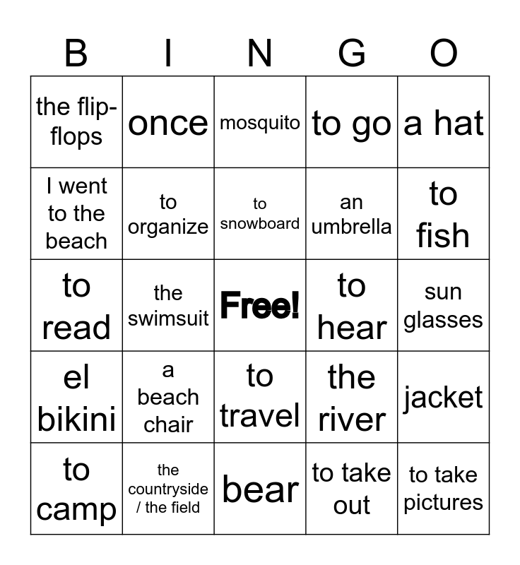 This bingo card has a free space and 64 words: scarf, gloves, boots, jacket, hotel, to ski, once, the other day, to snowboard, to bring, to travel, yesterday, sun glasses, a hat, last, I went to the beach, the swimsuit, the flip-flops, the sunscreen, an umbrella, a beach chair, el bikini, to go, to say, to see / to watch / to look at, to come, to have, to do, to be able to, to put, to want, to find, to look for, then, to fish, to camp, finally, to take out, to arrive, to organize, to read, to hear, to believe, the trail, the lake, to take pictures, the countryside / the field, the forest, the river, dolphin, seagull, bird, bear, shark, squirrel, penguin, mosquito, cow, horse, donkey, pig, goat, sheep and a cruise.