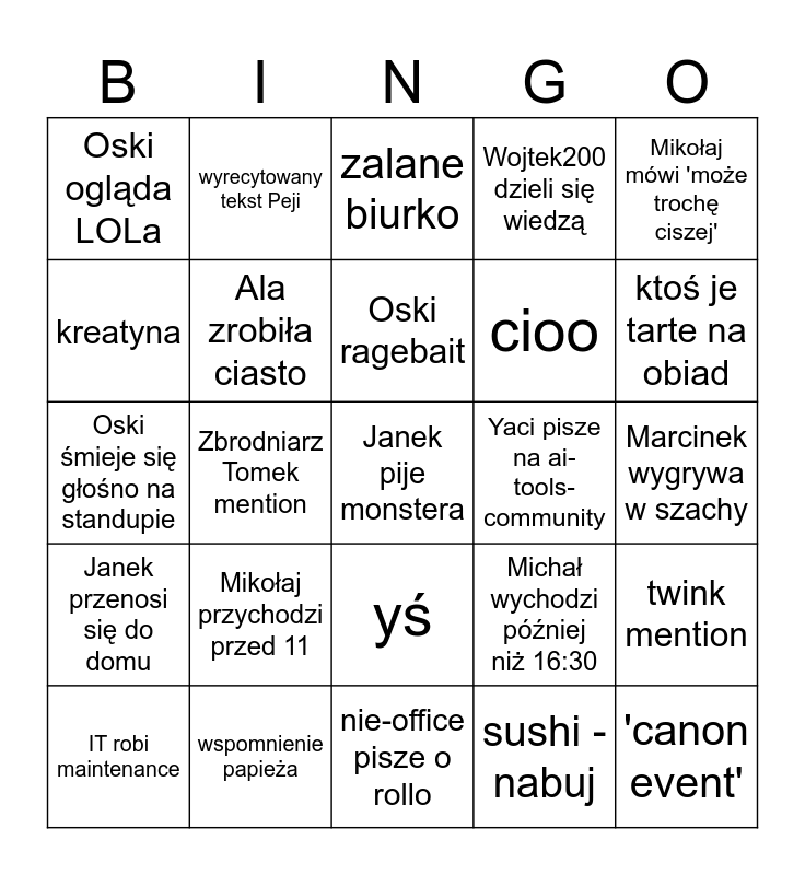 This bingo card has 80 words: Free!, Janek miauczy, zalane biurko, gra na gitarze, wordle, loldle, 67, bg alert, Janek mówi o macu, refill, wyjście do żaby, Łukasz boksuje w powietrzu, Wojtek200 dzieli się wiedzą, Oski ogląda LOLa, kostucha żart, kreatyna, Domin wychodzi po 16, Mikołaj przychodzi przed 11, Piszczu wygrywa w szachy, Marcinek wygrywa w szachy, ktoś kradnie Jankowi kabel, Mikołaj mówi 'może trochę ciszej', Oski śmieje się głośno na standupie, Oski ragebait, Ala zrobiła ciasto, do Janka dzwoni mama, Żymianie mention, Maciej mówi, że nie ma testów, propozycja zmiany prompta, Oski wdzwania się z telefonu, ktoś je tarte na obiad, Asia F pisze na usterce, nie-office pisze o rollo, 'canon event', IT robi maintenance, Yaci pisze na ai-tools-community, Stańczyk łapie się za głowę, tyran mentioned, Piszczu je rosół, Janek pije monstera, propozycja zmiany modelu, dziwne dane w paragonach coli, gencoding mention, Tomek Krug aaS, wyjście do kantyny, wyrecytowany tekst Peji, Piotrk mówi ‘cześć brand guardian’, przychodzi cham od roślin, nre-photos robione, Wojdylak mówi chłop z chłopem, twink mention, Zbrodniarz Tomek mention, Michał wychodzi później niż 16:30, Michał siedzi w słuchawkach i nie jest na spotkaniu, Alabor przychodzi na bajere, Mikołaj ma homofis, ktoś je rollo, brudne naczynia w zlewie, Janek mówi “co byś chciała?”, yś, cioo, wyjście na fajkę, Julia i Oski widzieli to samo na X, Janek narzeka na jedzenie, Kwasiura, Julia mówi że ktoś marnuje jej czas, Piszczu nie wie czegoś oczywistego, 9+ ludzi na barówce, rozmowa chuja z butem, cutscenka, Janek przenosi się do domu, wspomnienie papieża, growth day mention, Oski mówi o pudełkach, kawowy golem, Janek mówi że morsował, sushi - nabuj, Marcinek mówi coś na serio, Piszczu pyta and Robert mówi o LoLu.