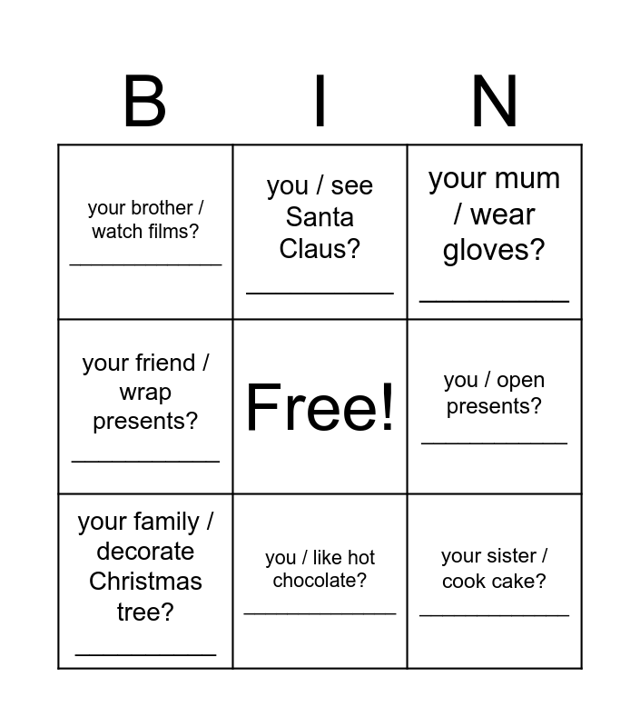 This bingo card has a free space and 8 words: you / open presents? ____________, your mum / wear gloves? _________, you / see Santa Claus? __________, your family / decorate Christmas tree? __________, your brother / watch films? ______________, your sister / cook cake? _____________, your friend / wrap presents? ___________ and you / like hot chocolate? ______________.