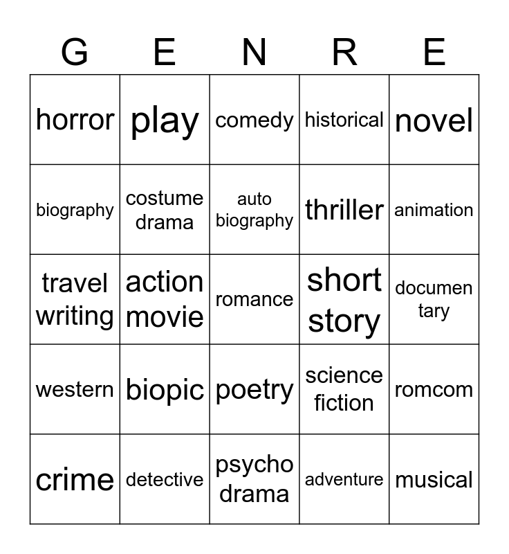 This bingo card has 25 words: biopic, psycho drama, auto biography, crime, novel, horror, biography, play, short story, poetry, thriller, travel writing, science fiction, romcom, costume drama, musical, documen tary, comedy, animation, action movie, romance, detective, western, historical and adventure.