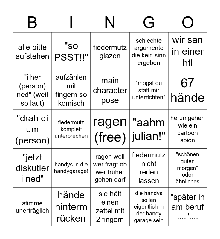 This bingo card has a free space and 24 words: handys in die handygarage!, hände hinterm rücken, main character pose, stimme unerträglich, wir san in einer htl, alle bitte aufstehen, "i her (person) ned" (weil so laut), "so PSST!!", "aahm julian!", ragen weil wer fragt ob wer früher gehen darf, "mogst du statt mir unterrichten", "drah di um (person), fiedermutz nicht reden lassen, "schönen guten morgen" oder ähnliches, aufzählen mit fingern so komisch, die handys sollen eigentlich in der handy garage sein, herumgehen wie ein cartoon spion, fiedermutz glazen, 67 hände, fiedermutz komplett unterbrechen, "später in am beruf ...."...., "jetzt diskutier i ned", schlechte argumente die kein sinn ergeben and sie hält einen zettel mit 2 fingern.
