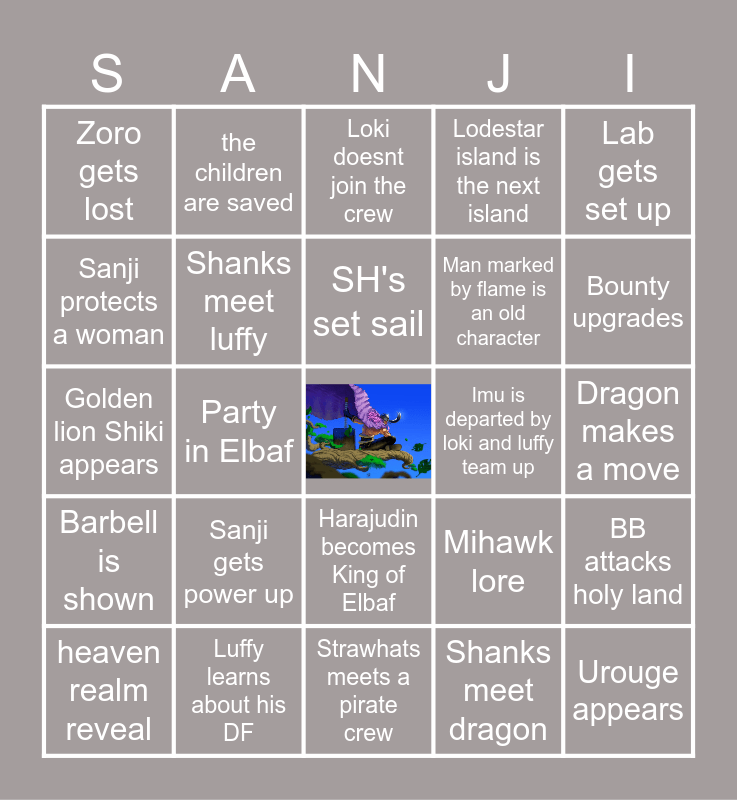 This bingo card has a free space and 24 words: Sanji gets power up, Luffy learns about his DF, SH's set sail, heaven realm reveal, Lab gets set up, Zoro gets lost, Sanji protects a woman, the children are saved, Imu is departed by loki and luffy team up, Harajudin becomes King of Elbaf, Man marked by flame is an old character, Golden lion Shiki appears, Mihawk lore, BB attacks holy land, Shanks meet luffy, Shanks meet dragon, Dragon makes a move, Loki doesnt join the crew, Bounty upgrades, Party in Elbaf, Urouge appears, Barbell is shown, Lodestar island is the next island and Strawhats meets a pirate crew.