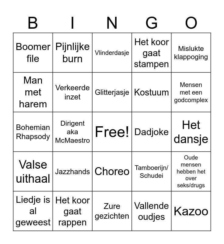 This bingo card has a free space and 24 words: Jazzhands, Het koor gaat rappen, Glitterjasje, Liedje is al geweest, Mislukte klappoging, Boomer file, Man met harem, Pijnlijke burn, Dadjoke, Choreo, Kostuum, Bohemian Rhapsody, Tamboerijn/ Schudei, Oude mensen hebben het over seks/drugs, Verkeerde inzet, Vallende oudjes, Het dansje, Vlinderdasje, Mensen met een godcomplex, Dirigent aka McMaestro, Kazoo, Valse uithaal, Het koor gaat stampen and Zure gezichten.