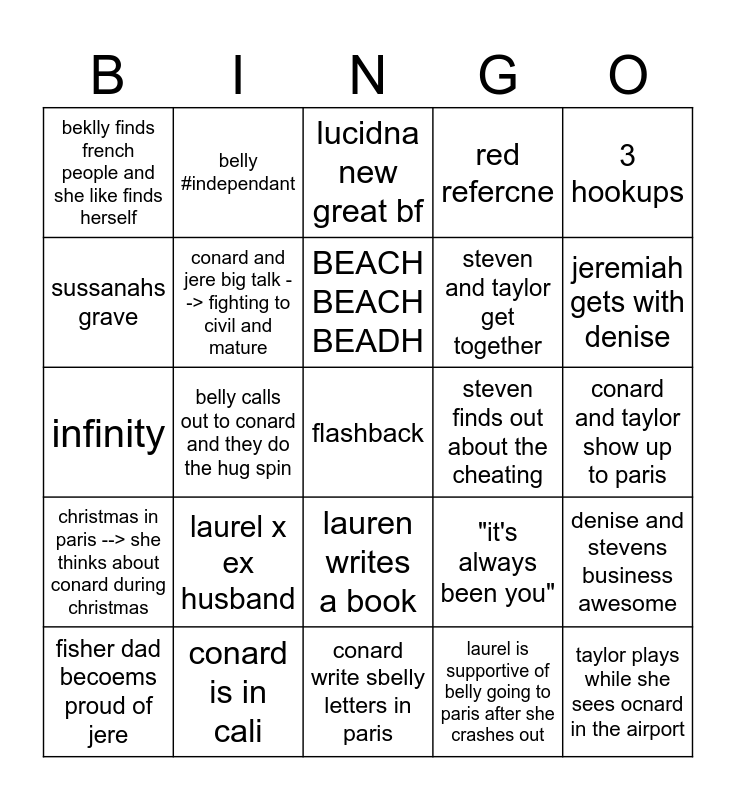 This bingo card has a free space and 24 words: laurel x ex husband, conard is in cali, BEACH BEACH BEADH, fisher dad becoems proud of jere, 3 hookups, beklly finds french people and she like finds herself, sussanahs grave, belly #independant, steven finds out about the cheating, lauren writes a book, steven and taylor get together, infinity, "it's always been you", denise and stevens business awesome, conard and jere big talk --> fighting to civil and mature, laurel is supportive of belly going to paris after she crashes out, conard and taylor show up to paris, lucidna new great bf, jeremiah gets with denise, belly calls out to conard and they do the hug spin, taylor plays while she sees ocnard in the airport, christmas in paris --> she thinks about conard during christmas, red refercne and conard write sbelly letters in paris.