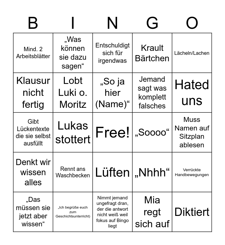 This bingo card has a free space and 24 words: Rennt ans Waschbecken, „Ich begrüße euch zum Geschichtsunterricht), „So ja hier (Name)“, „Das müssen sie jetzt aber wissen“, Lächeln/Lachen, Mind. 2 Arbeitsblätter, Klausur nicht fertig, „Was können sie dazu sagen“, „Soooo“, Lüften, Jemand sagt was komplett falsches, Gibt Lückentexte die sie selbst ausfüllt, „Nhhh“, Verrückte Handbewegungen, Lobt Luki o. Moritz, Mia regt sich auf, Muss Namen auf Sitzplan ablesen, Entschuldigt sich für irgendwas, Hated uns, Lukas stottert, Diktiert, Denkt wir wissen alles, Krault Bärtchen and Nimmt jemand ungefragt dran, der die antwort nicht weiß weil fokus auf Bingo liegt.