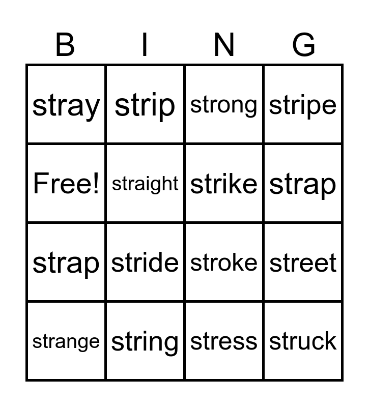 This bingo card has 16 words: string, street, strong, stray, strap, strip, stroke, stress, Free!, straight, strange, stripe, stride, strap, strike and struck.
