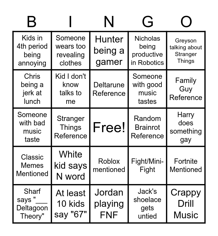 This bingo card has a free space and 24 words: White kid says N word, At least 10 kids say "67", Deltarune Reference, Sharf says "___ Deltagoon Theory", Greyson talking about Stranger Things, Kids in 4th period being annoying, Chris being a jerk at lunch, Someone wears too revealing clothes, Random Brainrot Reference, Roblox mentioned, Someone with good music tastes, Someone with bad music taste, Fight/Mini-Fight, Fortnite Mentioned, Kid I don't know talks to me, Jack's shoelace gets untied, Harry does something gay, Hunter being a gamer, Family Guy Reference, Stranger Things Reference, Crappy Drill Music, Classic Memes Mentioned, Nicholas being productive in Robotics and Jordan playing FNF.