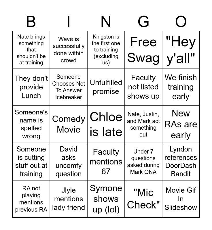 This bingo card has a free space and 24 words: David asks uncomfy question, Jlyle mentions lady friend, Unfulfilled promise, RA not playing mentions previous RA, "Hey y'all", Nate brings something that shouldn't be at training, They don't provide Lunch, Wave is successfully done within crowd, Nate, Justin, and Mark act something out, Faculty mentions 67, Faculty not listed shows up, Someone's name is spelled wrong, Under 7 questions asked during Mark QNA, Lyndon references DoorDash Bandit, Someone Chooses Not To Answer Icebreaker, "Mic Check", New RAs are early, Kingston is the first one to training (excluding us), We finish training early, Comedy Movie, Movie Gif In Slideshow, Someone is cutting stuff out at training, Free Swag and Symone shows up (lol).