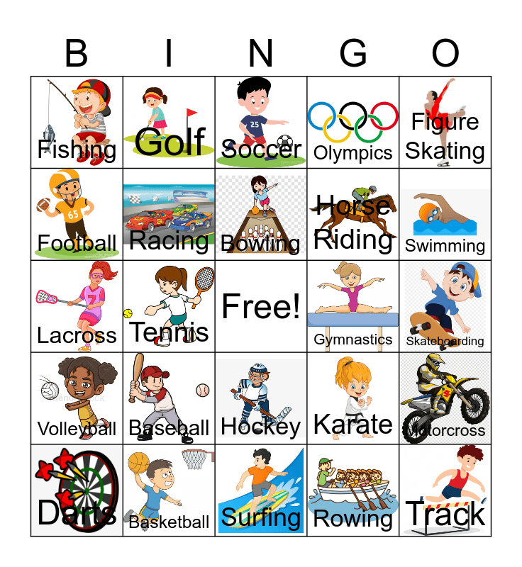 This bingo card has 24 images, a free space and 24 words: Baseball, Basketball, Bowling, Darts, Figure Skating, Fishing, Football, Golf, Gymnastics, Hockey, Horse Riding, Lacross, Karate, Motorcross, Racing, Rowing, Skateboarding, Soccer, Swimming, Tennis, Track, Volleyball, Olympics and Surfing.