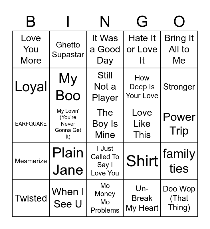 This bingo card has 38 words: Back & Forth, Rock With U (Awww Baby), Love On Top, My Boo, family ties, Plain Jane, Still Not a Player, Soldier, Bring It All to Me, How Deep Is Your Love, My Lovin' (You're Never Gonna Get It), Hate It or Love It, The Boy Is Mine, Power Trip, Loyal, Mesmerize, You Dropped a Bomb On Me, It Was a Good Day, Come & Talk to Me, Love Like This, Love You More, When I See U, Stronger, Twisted, Touch My Body, Mo Money Mo Problems, Doo Wop (That Thing), Breakin' My Heart (Pretty Brown Eyes), Dilemma, Roses, Buy U a Drank, I Just Called To Say I Love You, Un-Break My Heart, Ghetto Supastar, On My Mama, Shirt, EARFQUAKE and Where the Party At.