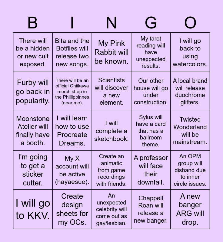 This bingo card has a free space and 24 words: My X account will be active (hayaesue)., Create design sheets for my OCs., Scientists will discover a new element., I will go to KKV., I will go back to using watercolors., There will be a hidden or new cult exposed., Furby will go back in popularity., Bita and the Botflies will release two new songs., Sylus will have a card that has a ballroom theme., Create an animatic from game recordings with friends., Our other house will go under construction., Moonstone Atelier will finally have a booth., A professor will face their downfall., An OPM group will disband due to inner circle issues., There will be an official Chiikawa merch shop in the Phillippinnes (near me)., Chappell Roan will release a new banger., Twisted Wonderland will be mainstream., My Pink Rabbit will be known., A local brand will release duochrome glitters., I will learn how to use Procreate Dreams., A new banger ARG will drop., I'm going to get a sticker cutter., My tarot reading will have unexpected results. and An unexpected celebrity will come out as gay/lesbian..