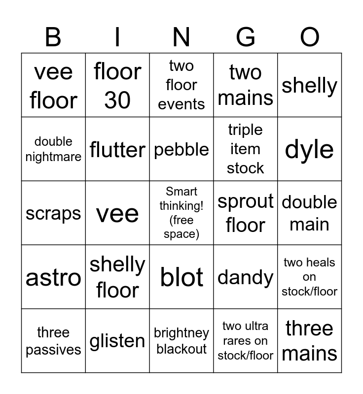This bingo card has a free space and 40 words: goob, scraps, gigi, flutter, glisten, blot, pebble, sprout, shelly, astro, vee, two mains, three mains, double main, sprout floor, shelly floor, astro floor, vee floor, main on a main floor, two floor events, two heals on stock/floor, two ultra rares on stock/floor, triple item stock, double nightmare, triple nightmare, trinket floor, double trinket floor, triple trinket floor, double debuff, triple debuff, two passives, three passives, free floor, dandy, dyle, brightney blackout, floor 10, floor 20, floor 30 and research hungry.
