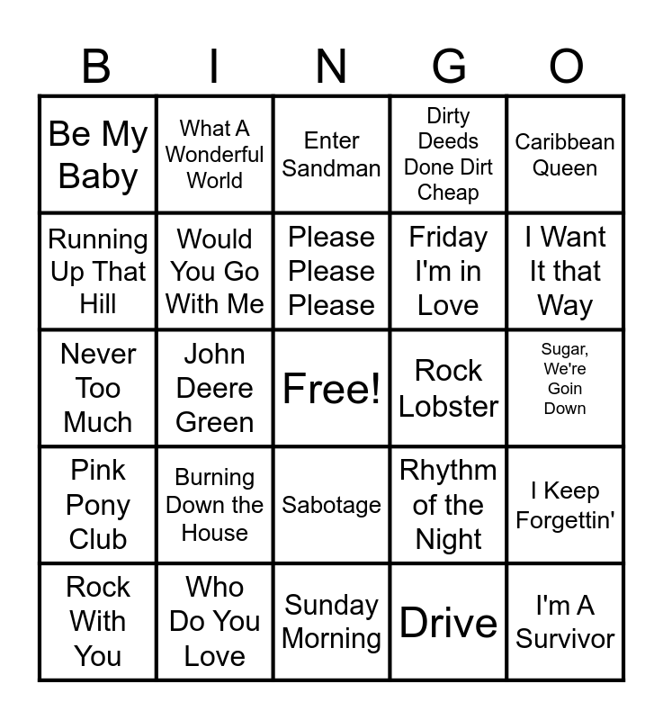 This bingo card has a free space and 24 words: Burning Down the House, Who Do You Love, Please Please Please, Rock With You, Caribbean Queen, Be My Baby, Running Up That Hill, What A Wonderful World, Rock Lobster, Sabotage, Friday I'm in Love, Never Too Much, Rhythm of the Night, I Keep Forgettin', Would You Go With Me, Drive, Sugar, We're Goin Down, Enter Sandman, I Want It that Way, John Deere Green, I'm A Survivor, Pink Pony Club, Dirty Deeds Done Dirt Cheap and Sunday Morning.