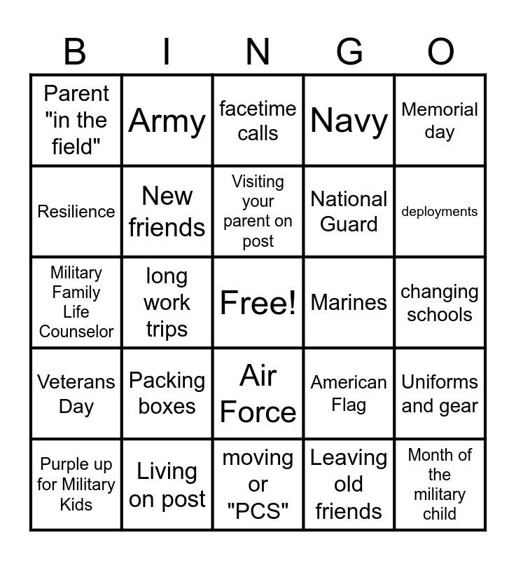 This bingo card has a free space and 24 words: Packing boxes, Living on post, Visiting your parent on post, Purple up for Military Kids, Memorial day, Parent "in the field", Resilience, Army, Marines, Air Force, National Guard, Military Family Life Counselor, American Flag, Uniforms and gear, New friends, Leaving old friends, changing schools, facetime calls, deployments, long work trips, Month of the military child, Veterans Day, Navy and moving or "PCS".