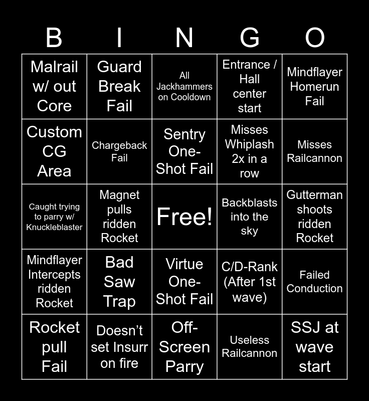 This bingo card has a free space and 39 words: Random Gasoline, CE Shotgun, Fails Quickmount 2x in a row, Chargeback Fail, Rocket pull Fail, Virtue One-Shot Fail, Sentry One-Shot Fail, Guttertank Punched, Mindflayer Homerun Fail, Mindflayer Intercepts ridden Rocket, Magnet pulls ridden Rocket, Entrance / Hall center start, SSJ at wave start, Gutterman shoots ridden Rocket, Backblasts into the sky, Bad Saw Trap, Jumpstart Cord Snap, Malrail w/ out Core, Whiplash idol'd enemy, C/D-Rank (After 1st wave), Custom CG Area, Off-Screen Parry, Misses Whiplash 2x in a row, Misses Railcannon, Instant Corkscrew Blow, E-Rail w/ out Coins or Nails, Misses Coins, Coin hits core/rocket, Floor Dweller, Guard Break Fail, Draws Weapon, Does Nothing, Pauses CG Run, All Jackhammers on Cooldown, Doesn’t set Insurr on fire, Useless Railcannon, Forgets to use Railcannon 2x in a row, Failed Conduction, Caught trying to parry w/ Knuckleblaster and Iconoclasm Fail.