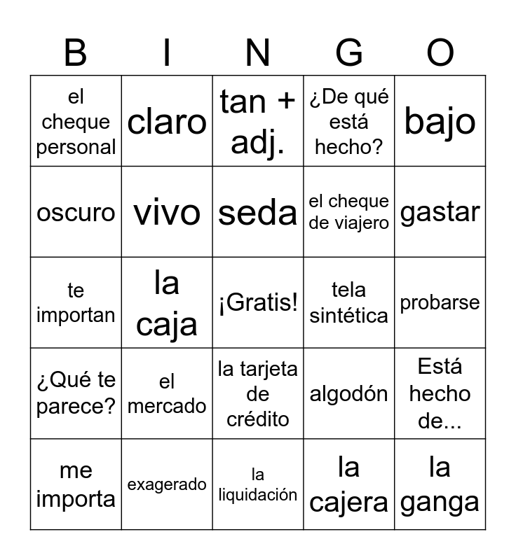 This bingo card has a free space and 50 words: la entrada, la ganga, el letrero, la liquidación, el mercado, la salida, claro, de sólo un color, oscuro, pastel, vivo, ¿De qué está hecho?, Está hecho de..., algodón, cuero, lana, seda, tela sintética, alto, bajo, la caja, la cajera, el cheque personal, el cheque de viajero, el cupón de regalo, en efectivo, gastar, el precio, tan + adj., la tarjeta de crédito, apretado, escoger, estar de moda, el estilo, exagerado, flojo, la marca, mediano, el número, probarse, la talla, anunciar, encontrar, en realidad, me importa, te importan, inmediatamente, me parece que, ¿Qué te parece? and recientemente.