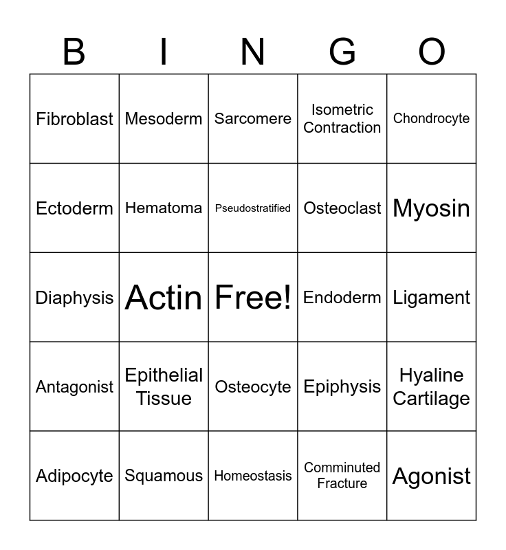 This bingo card has a free space and 24 words: Epithelial Tissue, Squamous, Pseudostratified, Adipocyte, Chondrocyte, Fibroblast, Ectoderm, Mesoderm, Endoderm, Osteocyte, Osteoclast, Diaphysis, Epiphysis, Hyaline Cartilage, Hematoma, Comminuted Fracture, Ligament, Sarcomere, Myosin, Actin, Agonist, Antagonist, Isometric Contraction and Homeostasis.