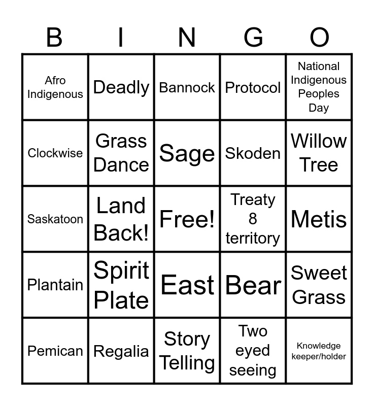 This bingo card has a free space and 29 words: Two-Spirit, Regalia, Bannock, Tia Wood, National Indigenous Peoples Day, Afro Indigenous, Grass Dance, Sage, Treaty 8 territory, Sweet Grass, Pemican, Land Back!, Two eyed seeing, Knowledge keeper/holder, Saskatoon, Tobacco, Story Telling, Bear, Willow Tree, Plantain, Spirit Plate, Birch Tree, Skoden, Metis, Clockwise, Deadly, East, Protocol and Smudge.
