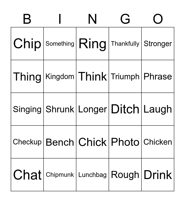 This bingo card has 76 words: Free!, Sing, Ring, Bring, King, Wing, Bank, Rank, Ink, Pink, Drink, Thing, Think, Thing, Thanks, Shrunk, Long, Longer, Finger, Stronger, Strength, Singing, Kingdom, Something, Thankfully, Longest, Young, Youngest, Graph, Phone, Phonics, Trophy, Nephew, Photo, Phrase, Triumph, Cough, Enough, Laugh, Rough, Elephant, Alphabet, Graph, Photograph, Telegraph, Autograph, Chat, Chip, Ship, Chop, Chin, Chick, Child, Check, Chess, Chest, Much, Such, Lunch, Bunch, Bench, Crunch, Munch, Batch, Catch, Match, Ditch, Pitch, Scratch, Stretch, Chicken, Checkup, Chipmunk, Itching, Lunchbag and Inchworm.