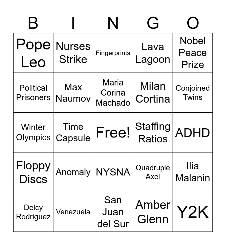 This bingo card has a free space and 24 words: Anomaly, Venezuela, Maria Corina Machado, Delcy Rodriguez, Nobel Peace Prize, Pope Leo, Political Prisoners, Nurses Strike, Staffing Ratios, NYSNA, Milan Cortina, Winter Olympics, Quadruple Axel, Ilia Malanin, Max Naumov, Amber Glenn, ADHD, Fingerprints, Conjoined Twins, Time Capsule, Y2K, Floppy Discs, Lava Lagoon and San Juan del Sur.