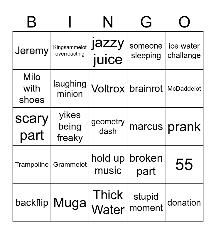 This bingo card has a free space and 24 words: Grammelot, Muga, Voltrox, backflip, ice water challange, Jeremy, Milo with shoes, Kingsammelot overreacting, marcus, hold up music, brainrot, scary part, broken part, 55, laughing minion, stupid moment, prank, jazzy juice, McDaddelot, yikes being freaky, donation, Trampoline, someone sleeping and Thick Water.