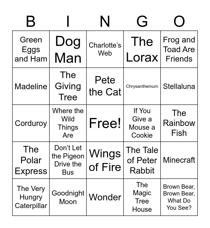 This bingo card has a free space and 29 words: The Very Hungry Caterpillar, Pete the Cat, Where the Wild Things Are, The Day the Crayons Quit, Green Eggs and Ham, Charlotte’s Web, The Giving Tree, Don’t Let the Pigeon Drive the Bus, If You Give a Mouse a Cookie, Goodnight Moon, The Rainbow Fish, Brown Bear, Brown Bear, What Do You See?, Wonder, The Magic Tree House, Stellaluna, The Bad Guys, Wings of Fire, The Polar Express, Frog and Toad Are Friends, Corduroy, The Tale of Peter Rabbit, Click, Clack, Moo: Cows That Type, Chrysanthemum, Madeline, The Lorax, Dog Man, Minecraft, Pete the Cat and Bad Kitty.