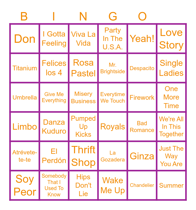 This bingo card has 51 words: Free!, Umbrella, Baby, Bad Romance, Firework, Hips Don't Lie, I Gotta Feeling, What Makes You Beautiful, Love Story, Wake Me Up, Titanium, Party In The U.S.A., Danza Kuduro, Limbo, Rakata, Ginza, Felices los 4, Give Me Everything, Love You Like A Love Song, Yeah!, Single Ladies, We're All In This Together, Don, Rosa Pastel, Sin Despertar, Atrévete-te-te, Mr. Brightside, Do I Wanna Know?, Pumped Up Kicks, Viva La Vida, Moves Like Jagger, Just The Way You Are, Rolling in the Deep, Shape of You, Somebody That I Used To Know, Royals, Thrift Shop, Chandelier, Summer, I Write Sins Not Tragedies, Misery Business, Everytime We Touch, Tik Tok, Low, El Perdón, La Gozadera, Despacito, Soy Peor, Tusa, One More Time and Hey Ya!.