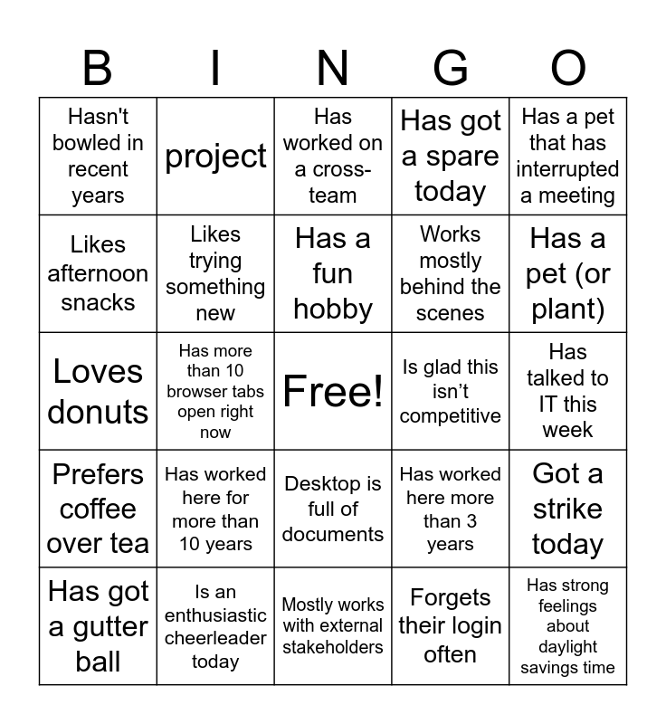 This bingo card has a free space and 27 words: Has worked here more than 3 years, Started within the last year, Works mostly behind the scenes, Mostly works with external stakeholders, Likes afternoon snacks, Has worked on a cross-team, project, Prefers coffee over tea, Is glad this isn’t competitive, Got a strike today, Loves donuts, Has got a spare today, Has got a gutter ball, Is an enthusiastic cheerleader today, Has a pet (or plant), Is new to the UW team, Likes trying something new, Has a fun hobby, Has worked here for more than 10 years, Hasn't bowled in recent years, Has talked to IT this week, Forgets their login often, Has more than 10 browser tabs open right now, Has strong feelings about daylight savings time, Desktop is full of documents, Has a pet that has interrupted a meeting and Has worn pajama bottoms during a workday.