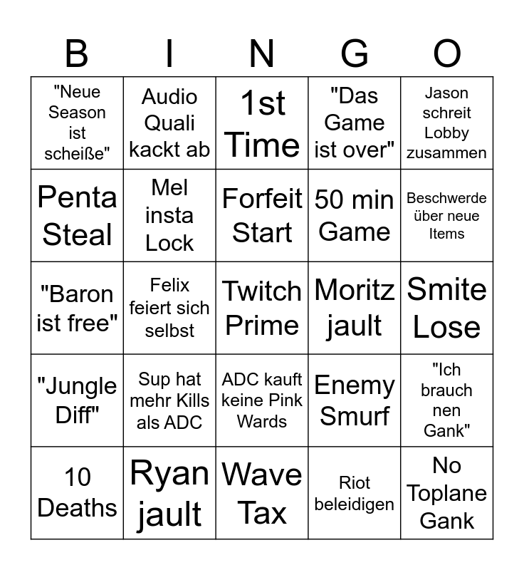 This bingo card has a free space and 24 words: Sup hat mehr Kills als ADC, Ryan jault, Forfeit Start, 10 Deaths, Jason schreit Lobby zusammen, "Neue Season ist scheiße", Penta Steal, Audio Quali kackt ab, Moritz jault, ADC kauft keine Pink Wards, 50 min Game, "Baron ist free", Enemy Smurf, "Ich brauch nen Gank", Mel insta Lock, Riot beleidigen, Smite Lose, 1st Time, Beschwerde über neue Items, Felix feiert sich selbst, No Toplane Gank, "Jungle Diff", "Das Game ist over" and Wave Tax.