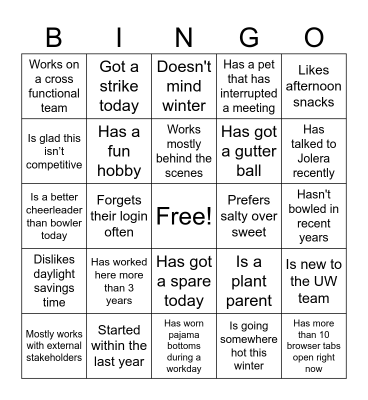This bingo card has a free space and 24 words: Has worked here more than 3 years, Started within the last year, Works mostly behind the scenes, Mostly works with external stakeholders, Likes afternoon snacks, Works on a cross functional team, Is glad this isn’t competitive, Got a strike today, Prefers salty over sweet, Has got a spare today, Has got a gutter ball, Is a better cheerleader than bowler today, Is a plant parent, Is new to the UW team, Has a fun hobby, Is going somewhere hot this winter, Hasn't bowled in recent years, Doesn't mind winter, Has talked to Jolera recently, Forgets their login often, Has more than 10 browser tabs open right now, Dislikes daylight savings time, Has a pet that has interrupted a meeting and Has worn pajama bottoms during a workday.
