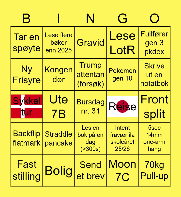 This bingo card has 2 images, a free space and 24 words: Fast stilling, Straddle pancake, Trump attentan (forsøk), Moon 7C, Fullfører gen 3 pkdex, Tar en spøyte, Lese flere bøker enn 2025, Gravid, Reise, Front split, Sykkel tur, Kongen dør, Intent fravær ila skoleåret 25/26, 5sec 14mm one-arm hang, Ny Frisyre, Bolig, Send et brev, Lese LotR, Skrive ut en notatbok, Backflip flatmark, Ute 7B, Les en bok på en dag (>300s), Pokemon gen 10 and 70kg Pull-up.