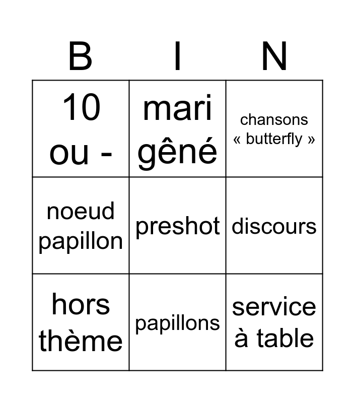This bingo card has a free space and 8 words: discours, chansons « butterfly », mari gêné, hors thème, 10 ou -, service à table, noeud papillon and papillons.