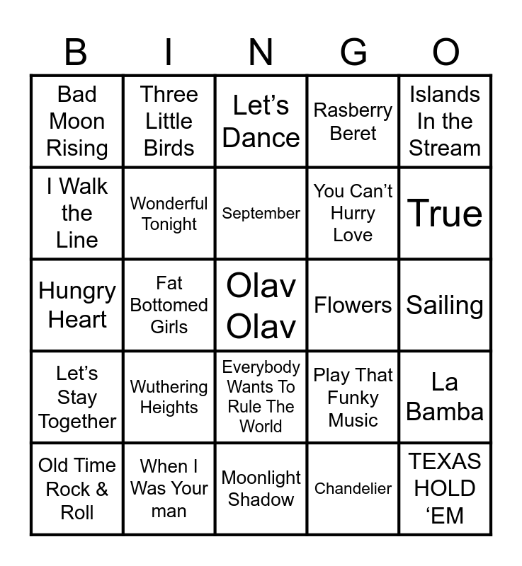 This bingo card has 25 words: Wuthering Heights, Moonlight Shadow, September, Old Time Rock & Roll, Islands In the Stream, Bad Moon Rising, I Walk the Line, Three Little Birds, Flowers, Everybody Wants To Rule The World, You Canβt Hurry Love, Hungry Heart, Play That Funky Music, La Bamba, Wonderful Tonight, TEXAS HOLD βEM, Sailing, Letβs Dance, True, Fat Bottomed Girls, Olav Olav, When I Was Your man, Letβs Stay Together, Rasberry Beret and Chandelier.