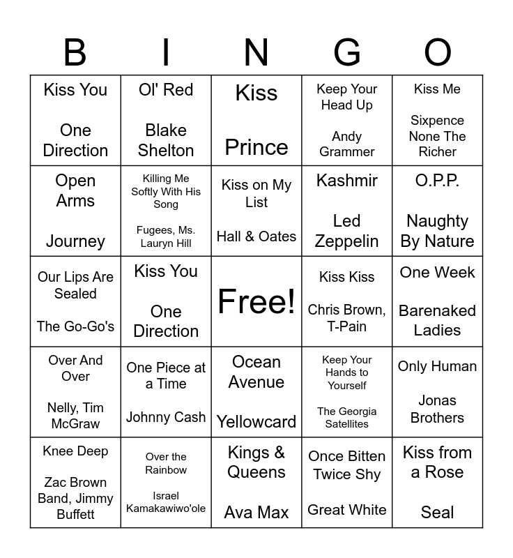 This bingo card has a free space and 57 words: Kill Bill SZA, Knee Deep Zac Brown Band, Jimmy Buffett, Kryptonite 3 Doors Down, Kiss You One Direction, Kings & Queens Ava Max, Kids MGMT, Killing Me Softly With His Song Fugees, Ms. Lauryn Hill, Karma Chameleon Culture Club, Kashmir Led Zeppelin, Keep on Loving You REO Speedwagon, Keep Your Head Up Andy Grammer, Keep Me in Mind Zac Brown Band, Kokomo The Beach Boys, Kung Fu Fighting Carl Douglas, Knockin' On Heaven's Door Guns N' Roses, Knock Knock Mac Miller, Kiss Me Sixpence None The Richer, Kiss You One Direction, Kick Myself Morgan Wallen, Kiss from a Rose Seal, Kiss Kiss Chris Brown, T-Pain, Karma Taylor Swift, Keep Your Hands to Yourself The Georgia Satellites, Kiss Prince, Kiss You All Over Exile, Kiss on My List Hall & Oates, Killer Queen Queen, Killin' Time Clint Black, O.P.P. Naughty By Nature, OMG USHER, On The Radio Donna Summer, One Love Bob Marley, One of These Nights Eagles, One Way Or Another Blondie, One Week Barenaked Ladies, Open Arms Journey, Our House Madness, Our Lips Are Sealed The Go-Go's, Owner of a Lonely Heart Yes, Over And Over Nelly, Tim McGraw, Ol' Red Blake Shelton, Ocean Avenue Yellowcard, Octopus's Garden The Beatles, One In Every Crowd Montgomery Gentry, Orinoco Flow Enya, On the Road Again Willie Nelson, One Piece at a Time Johnny Cash, Over the Rainbow Israel Kamakawiwo'ole, Over You Daughtry, One Dance Drake, One Thing At A Time Morgan Wallen, Once Bitten Twice Shy Great White, Only Wanna Be With You Hootie & The Blowfish, Only Time Enya, Only the Lonely Roy Orbison, Only Human Jonas Brothers and Orange Crush R.E.M..