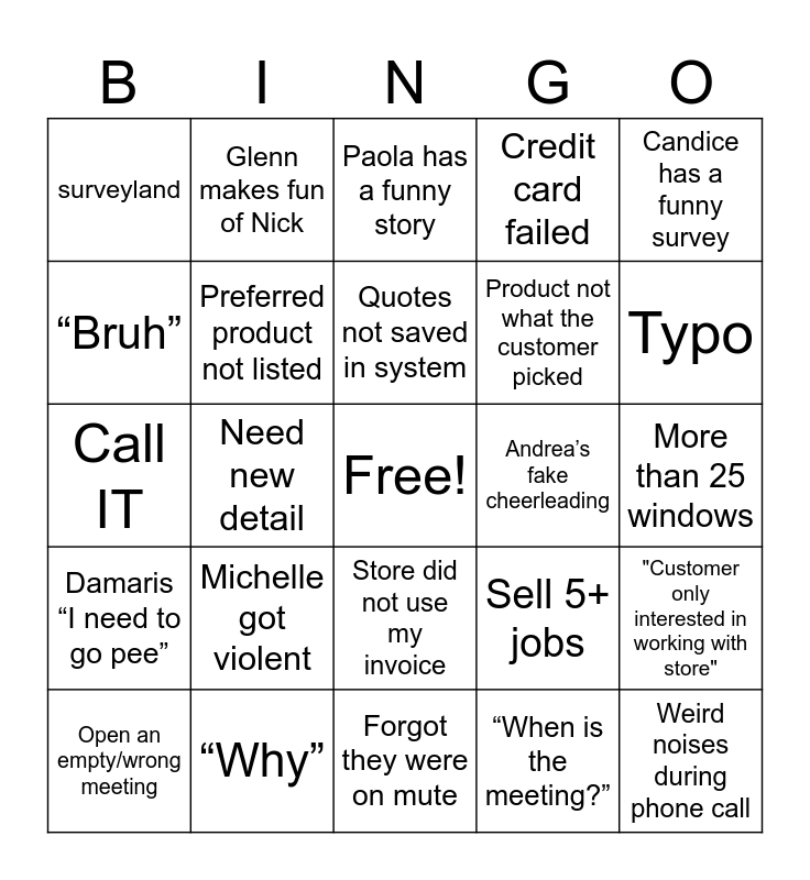 This bingo card has a free space and 38 words: Empty/Incorrect Detail uploaded by installer, Fake email, Rooms not labeled, Preferred product not listed, "Customer only interested in working with store", Michelle got violent, Quotes not saved in system, Customer ghost you, Candice has a funny survey, Product not what the customer picked, Need new detail, Credit card failed, Weird noises during phone call, More than 25 windows, “Bruh”, Damaris “I need to go pee”, Nicky throws 7 sarcastic comments, Paola has a funny story, Sing along in Tuesday’s meeting, Andrea’s fake cheerleading, surveyland, “Why”, Typo, Open an empty/wrong meeting, Forgot to exit meeting, Forgot they were on mute, Forgot to mute yourself, Crystle install manager skills saves the day, “I want to be you when I grow up”, Dri drops in to talk about food, Andrea confused on what happened in the chat, Store did not use my invoice, “When is the meeting?”, Glenn makes fun of Nick, Stephanie complains on not enough work, Sell 5+ jobs, Call IT and @everyone.