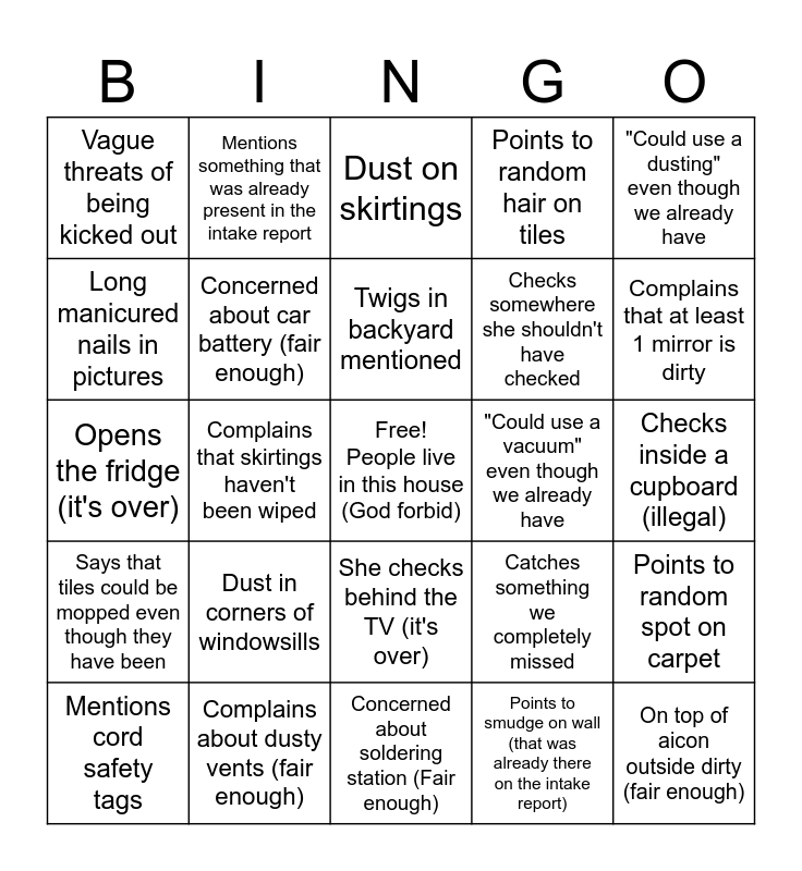 This bingo card has a free space and 24 words: Dust in corners of windowsills, Complains about dusty vents (fair enough), Twigs in backyard mentioned, Mentions cord safety tags, "Could use a dusting" even though we already have, Vague threats of being kicked out, Long manicured nails in pictures, Mentions something that was already present in the intake report, "Could use a vacuum" even though we already have, She checks behind the TV (it's over), Checks somewhere she shouldn't have checked, Opens the fridge (it's over), Catches something we completely missed, Points to random spot on carpet, Concerned about car battery (fair enough), Points to smudge on wall (that was already there on the intake report), Checks inside a cupboard (illegal), Dust on skirtings, Complains that at least 1 mirror is dirty, Complains that skirtings haven't been wiped, On top of aicon outside dirty (fair enough), Says that tiles could be mopped even though they have been, Points to random hair on tiles and Concerned about soldering station (Fair enough).