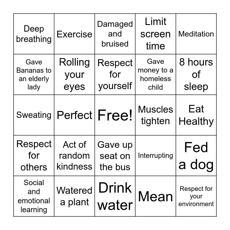 This bingo card has a free space and 24 words: Social and emotional learning, Act of random kindness, Respect for yourself, Mean, Meditation, Deep breathing, Exercise, Damaged and bruised, Muscles tighten, Eat Healthy, Sweating, Rolling your eyes, Interrupting, Fed a dog, Gave Bananas to an elderly lady, Watered a plant, Drink water, Limit screen time, 8 hours of sleep, Respect for others, Perfect, Gave up seat on the bus, Gave money to a homeless child and Respect for your environment.