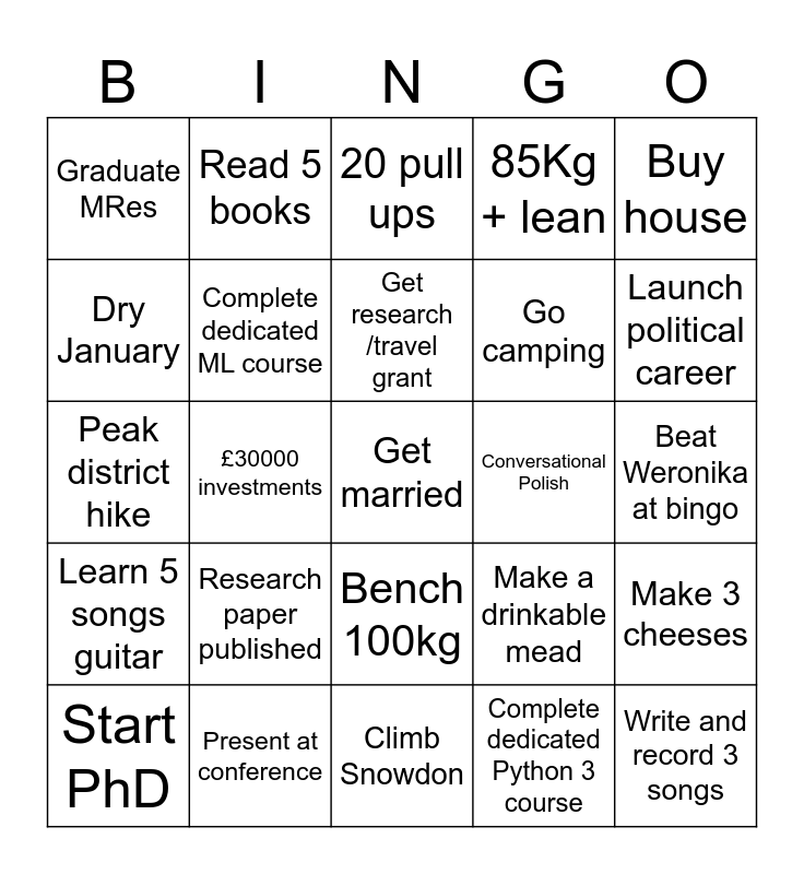 This bingo card has a free space and 24 words: Research paper published, Present at conference, Get research /travel grant, Start PhD, Buy house, Graduate MRes, Dry January, Read 5 books, Conversational Polish, Bench 100kg, Go camping, Peak district hike, Make a drinkable mead, Make 3 cheeses, Complete dedicated ML course, Complete dedicated Python 3 course, Beat Weronika at bingo, 20 pull ups, Launch political career, £30000 investments, Write and record 3 songs, Learn 5 songs guitar, 85Kg + lean and Climb Snowdon.