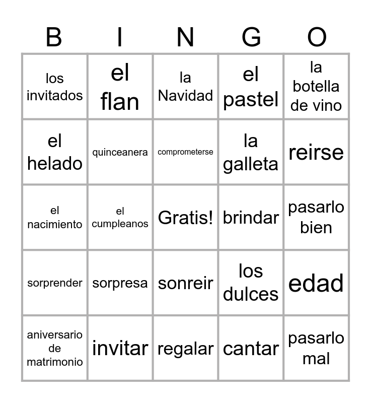 This bingo card has a free space and 29 words: aniversario de matrimonio, la boda, el cumpleanos, la fiesta, los invitados, la Navidad, quinceanera, sorpresa, brindar, invitar, pasarlo bien, pasarlo mal, regalar, cantar, reirse, relajarse, sonreir, sorprender, la botella de vino, el nacimiento, los dulces, el flan, la galleta, el helado, el pastel, el flan, edad, comprometerse and Bailar.