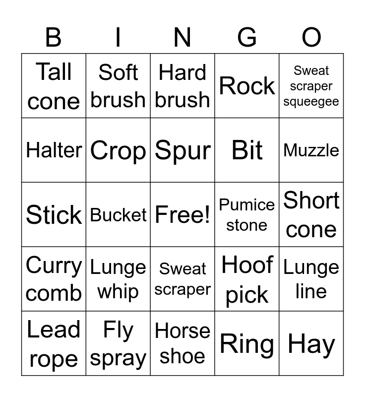 This bingo card has a free space and 27 words: Hoof pick, Saddle pad, Bit, Horse shoe, Halter, Hard brush, Soft brush, Curry comb, Pumice stone, Lunge line, Stick, Rock, Lead rope, Fly spray, Muzzle, Splint boot, Crop, Spur, Lunge whip, Tall cone, Short cone, Ring, Bucket, Hay, Sweat scraper, Sweat scraper squeegee and Hoof oil.